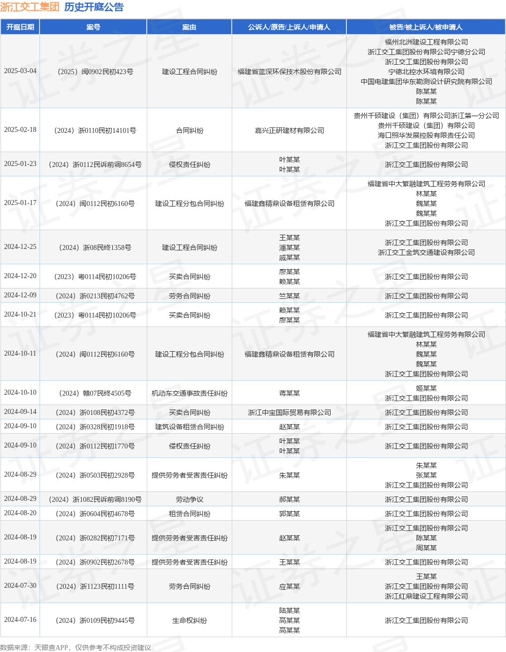 案号:(2024)浙0110民初14101号审理法院:杭州市余杭区人民法院案由:合同纠纷当事人信息: 原告/上诉人:嘉兴正研建材有限公司 被告/被上诉人:贵州千硕建设(集团)有限公司浙江第一分公司、贵州千硕建设(集团)有限公司、海口照华发展控股有限责任公司、浙江交工集团股份有限公司开庭日期:2025年2月18日根据统计,近一年内以浙江交工集团股份有限公司为当事人的历史开庭公告有54则,其中案由为“提供劳务者受害责任纠纷”的公告以8则居首,其次为“财产损害赔偿纠纷”有6则,“买卖合同纠纷”有4则。历史开庭公告(前20条)如下: